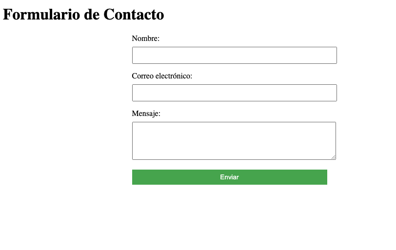 Dentro del formulario, hemos agregado tres campos de entrada: nombre, correo electrónico y mensaje. Cada campo se define utilizando la etiqueta <input> o <textarea>, y hemos utilizado el atributo name para identificar cada campo.